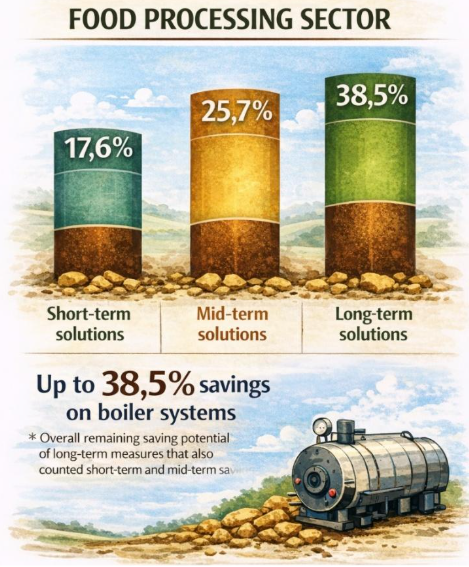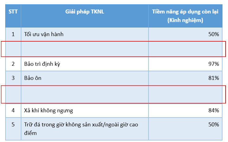 Ngành giấy và chế biến thực phẩm có biên độ TKNL lớn nhất nếu áp dụng các giải pháp liên quan đến hệ thống nén khí hoặc lò hơi. Tiềm năng TKNL có thể đạt tới 40% cho hệ thống nén khí và 38% cho hệ thống lò hơi nếu kết hợp vận hành thông minh với nâng cấp kỹ thuật ở mức vừa phải, như tối ưu hóa vận hành và giảm rò rỉ.