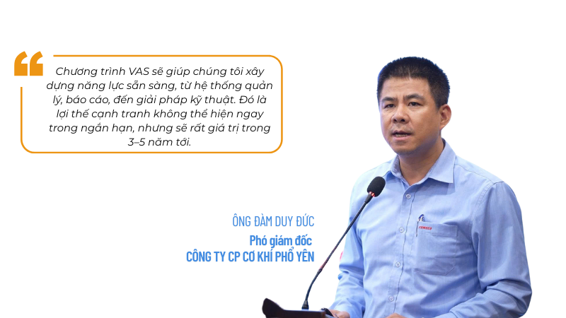 Trong tương lai gần, việc giảm phát thải carbon sẽ là yêu cầu bắt buộc từ phía khách hàng quốc tế – đặc biệt trong ngành cơ khí phụ trợ cho ô tô, xe máy. Chương trình VAS giúp chúng tôi xây dựng năng lực sẵn sàng, từ hệ thống quản lý, báo cáo, đến giải pháp kỹ thuật. Đó là lợi thế cạnh tranh không thể hiện ngay trong ngắn hạn, nhưng sẽ rất giá trị trong 3–5 năm tới.